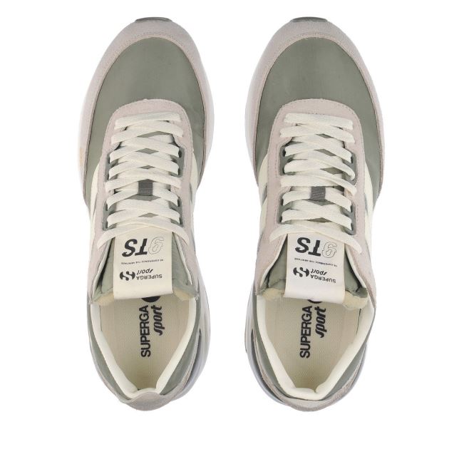 裏地のないペットのリサイクル ナイロン 100% のアッパーと、スエード効果のあるビーガン合成皮革のディテールを備えた新しい 9ts。 90 年代の「レトロランニング」モデルに典型的な目に見えるパディングを備えたシュータンのディテール。