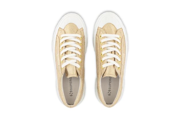 クラシックなスーパーガにモダンなひねりを加えたこのスニーカーは、光沢のあるラメのアッパーをラバーのトゥキャップで補強し、トレンドの実用的なタッチを加えています。ユニークな構造により、機能的でスタイリッシュな部分が同等に保たれます - 毎日の編集に楽にクールな追加. 高さ 4 Cm のウェッジを備えた加硫天然ゴムのアウトソール。