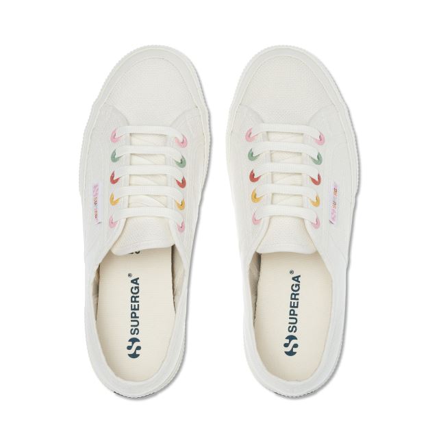 クラシック スペルガ 2750: キャンバス地の女性用スポーツ フットウェアで、アッパーには裏地がなく、非常に丈夫で通気性に優れたピュア コットンを使用しています。加硫天然ゴムのアウトソール。虹色のアイレットとラベル。